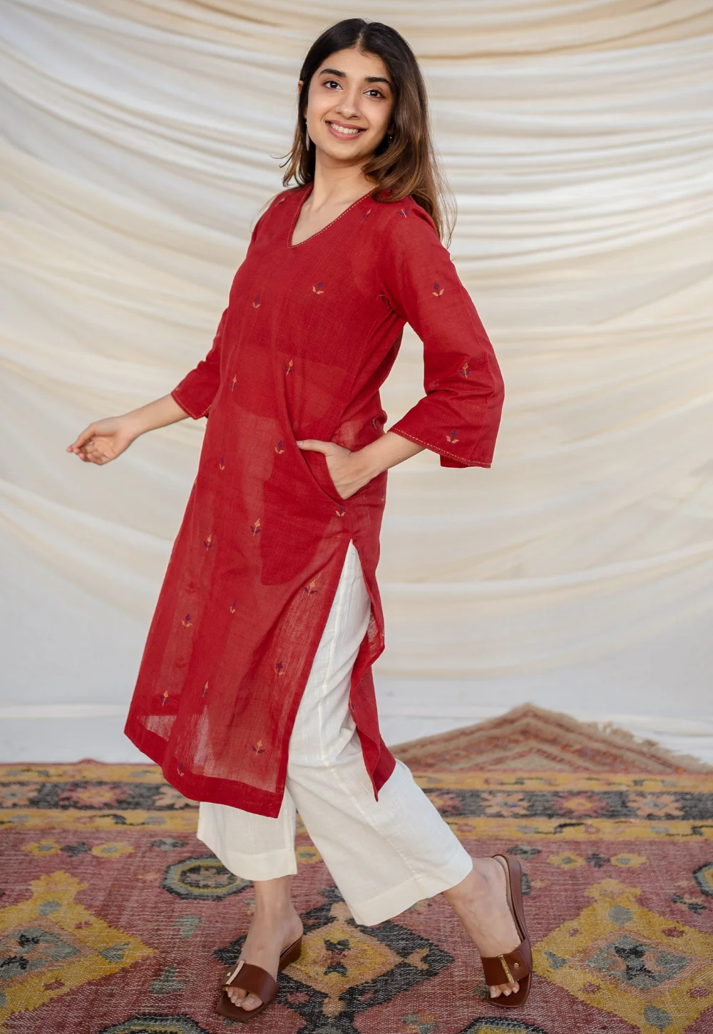 Red Jamdani Handwoven Cotton Kurta with HandBlock Printed