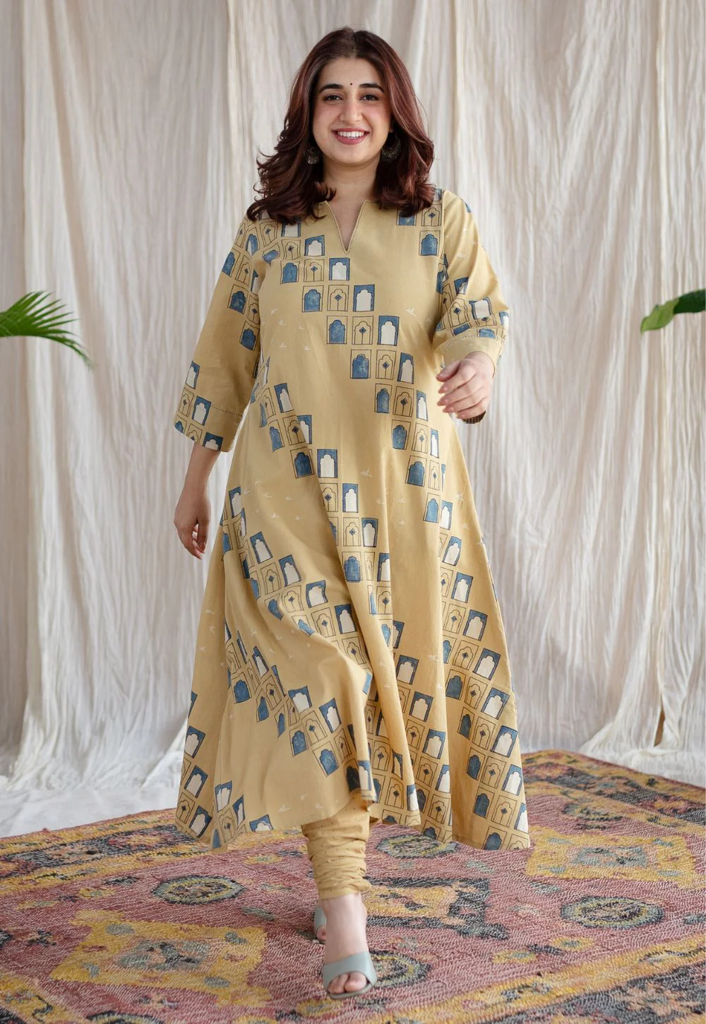 Yellow Ajrakh Handblock Printed Cotton Churidar Â