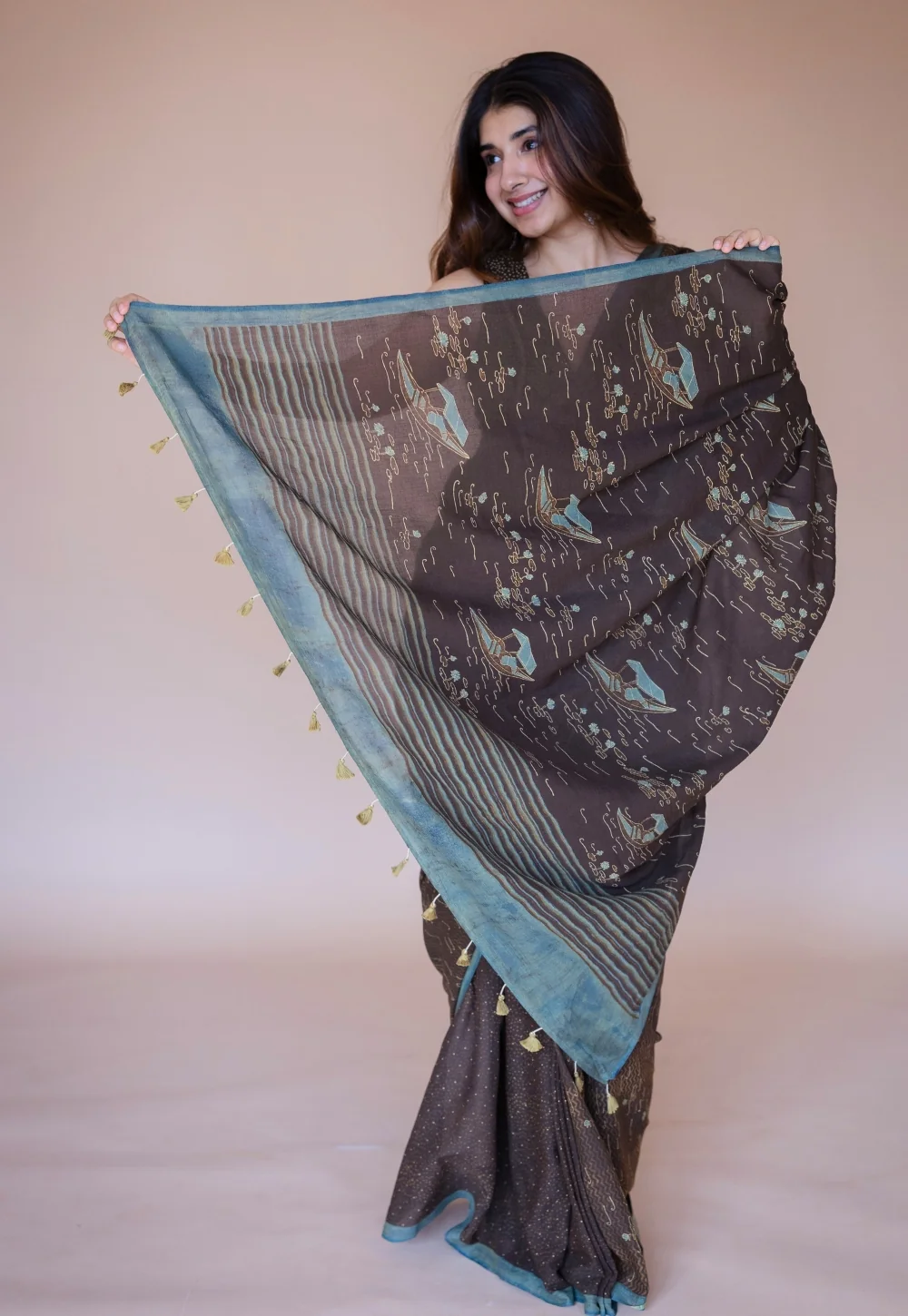 Dark Brown Boat Ajrakh Hand Block Print Mul Saree with Unstitched Blouse.