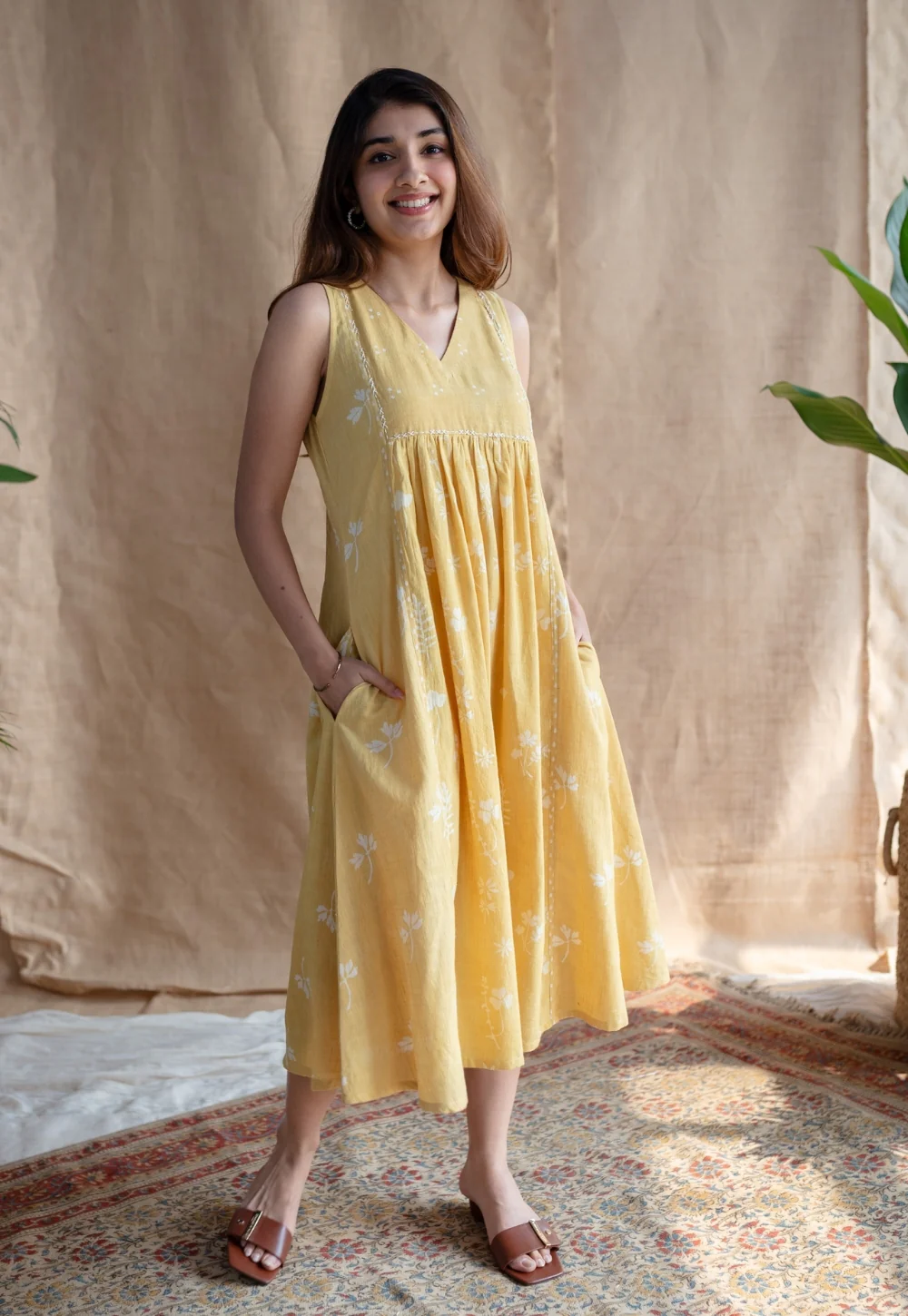 Yellow Dabu Slub Cotton Dress with Handblock Printed and Hand Embroidery Details