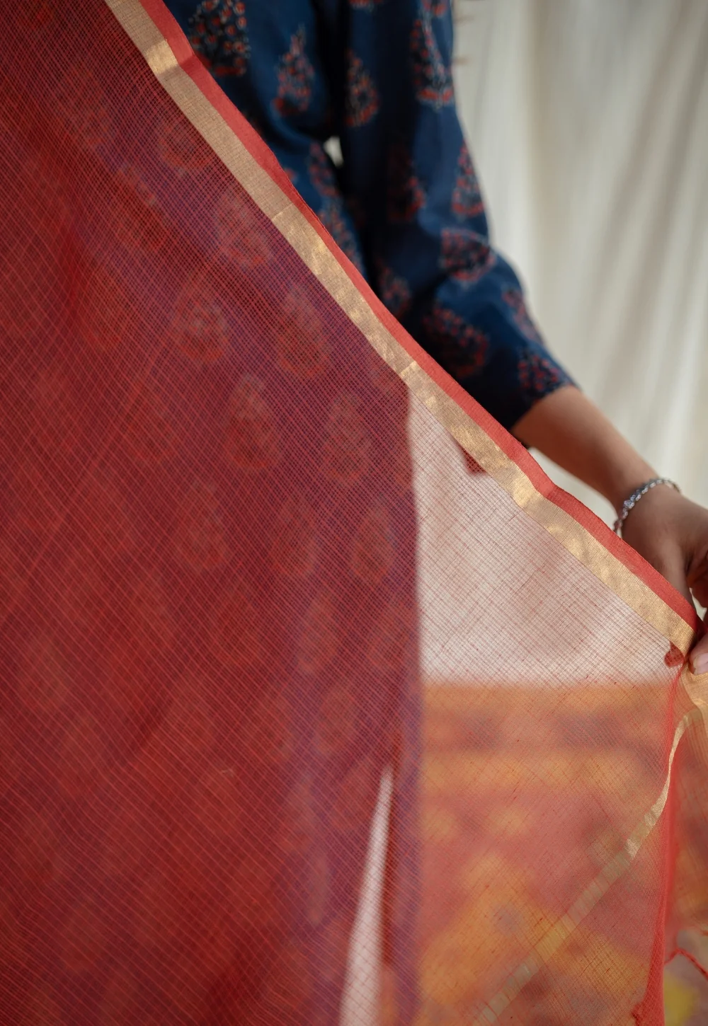 Red Kota Doria Cotton Dupatta with Gold Zari Border