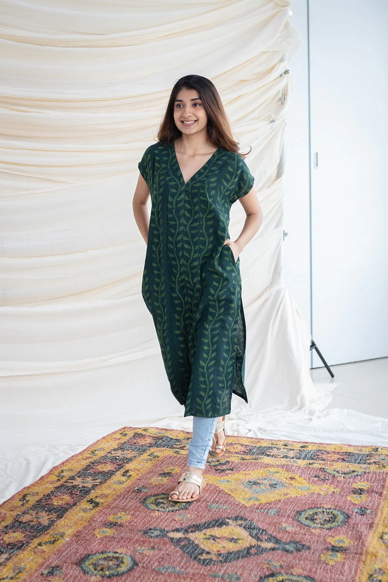 Green Dabu Straight Slub Cotton Kurta with Hand Block Printing.