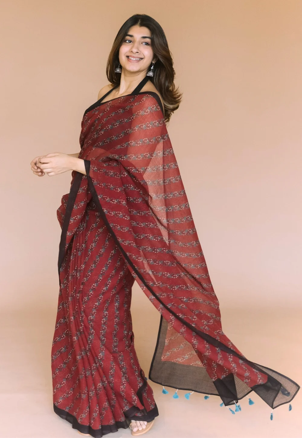 Madder Floral Ajrakh Hand Block Print Kota Doria Cotton Saree with Unstitched Blouse.