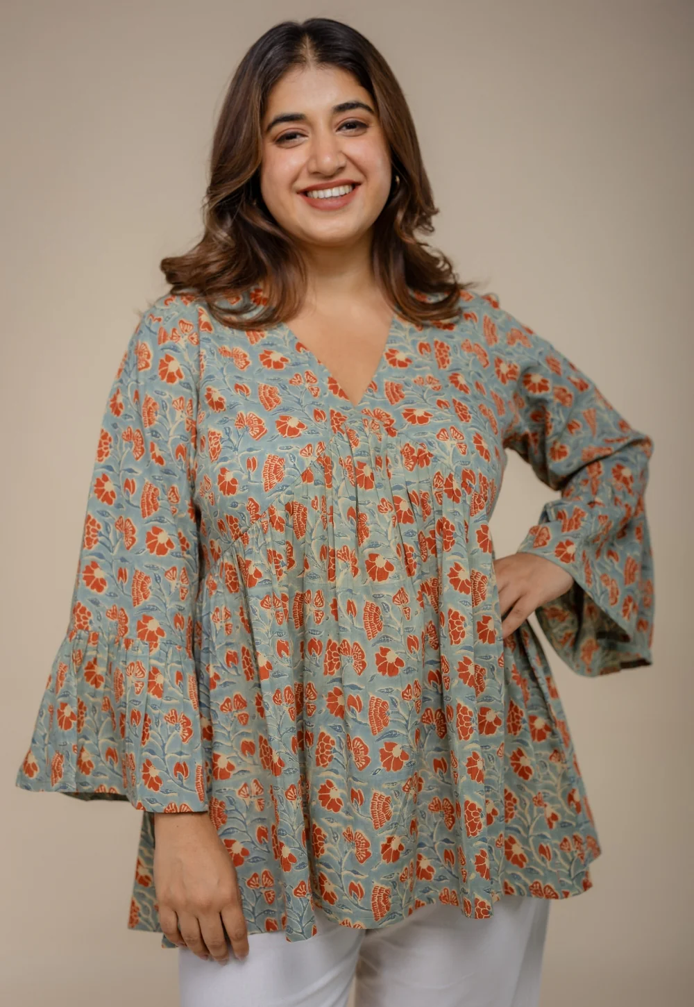 Light Indigo Ajrakh Handblock Printed Cotton A Line Short Top.